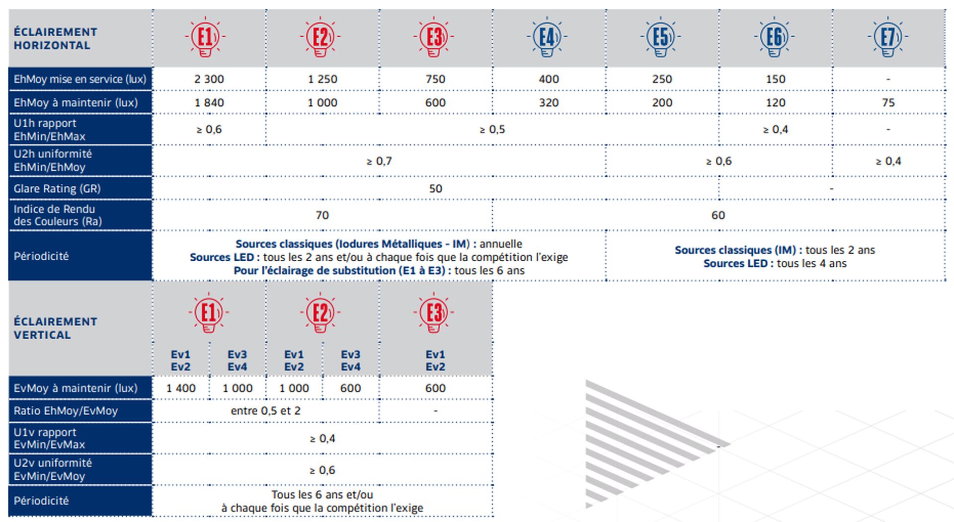 Pour un terrain de football de 105 ml x 68 ml, afin de limiter l’éblouissement, la valeur du taux d’éblouissement (GR) est inférieure ou égale à 50 pour les niveaux E1 à E5 (échelle croissante d’éblouissement de 0 à 100).