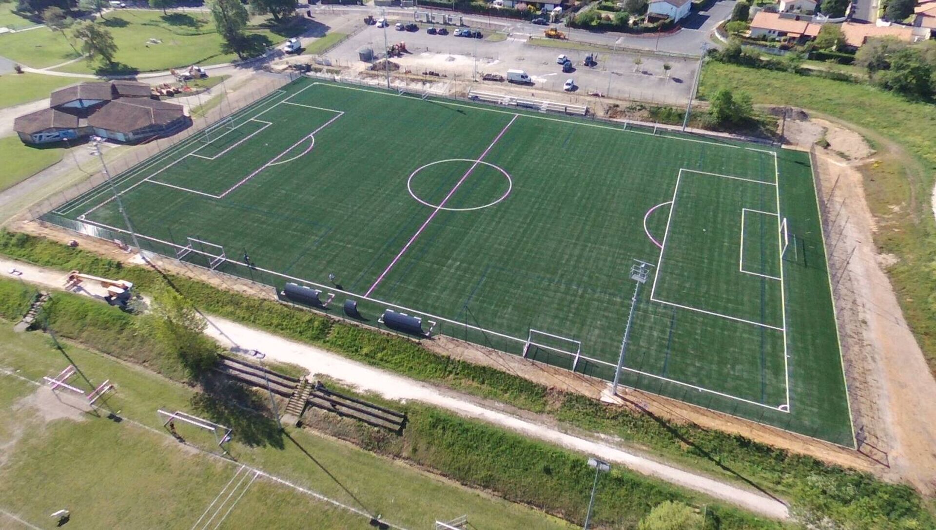 Transformation d'un terrain de football enherbé en gazon synthétique à Carbon Blanc, près de Bordeaux. Le projet a inclus des améliorations de sécurité, un système de drainage, un éclairage LED, des gradins, et des aménagements VRD.